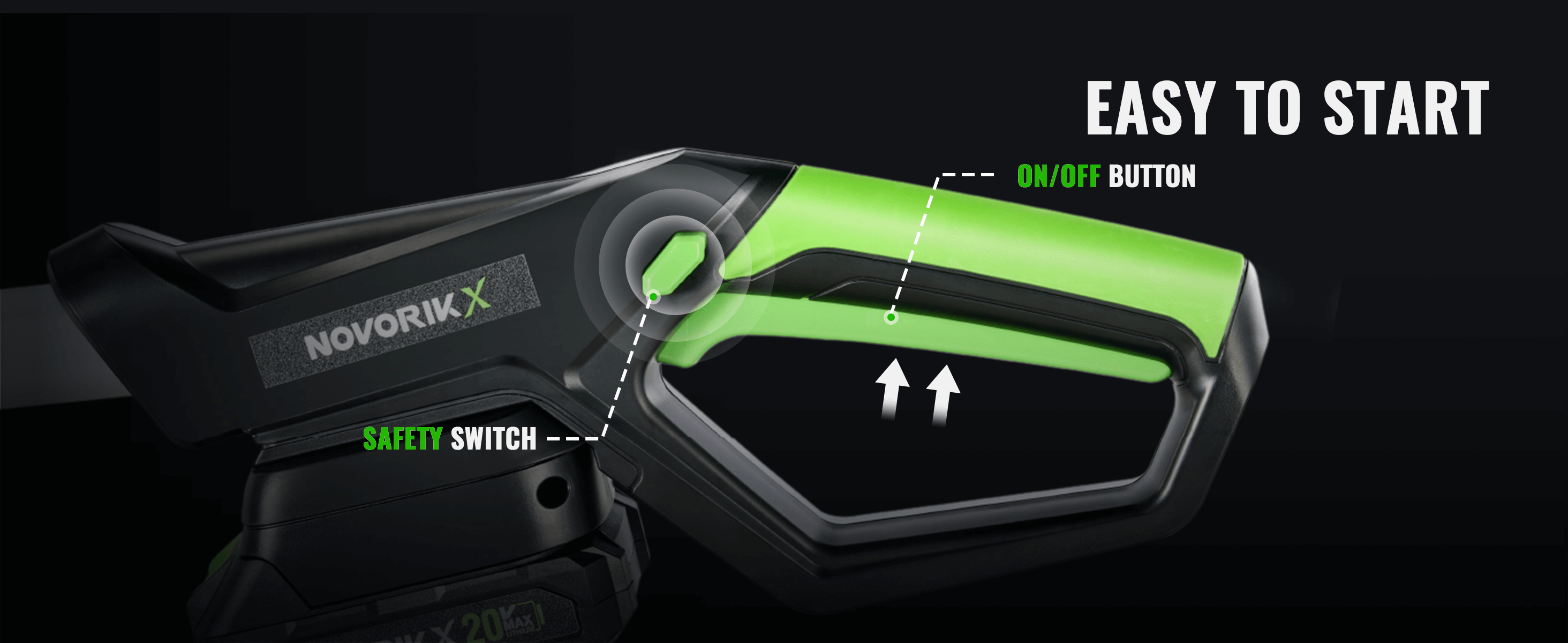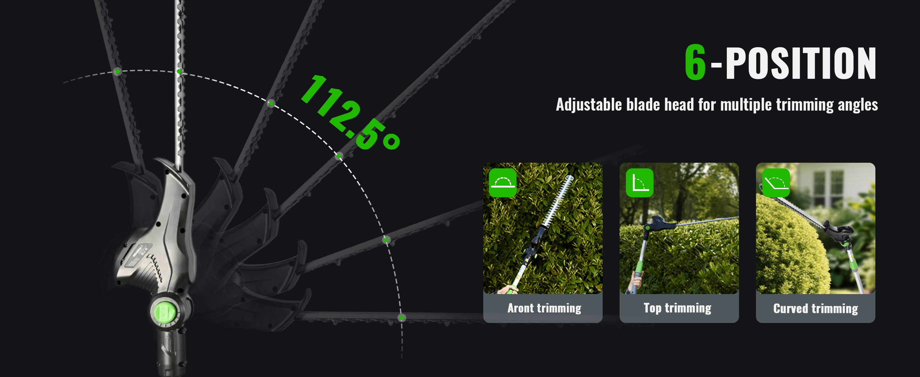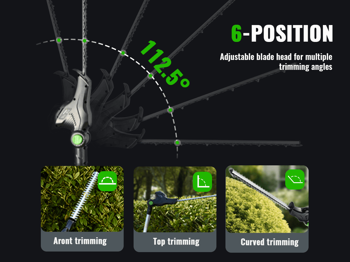 The 6-position adjustable head swivels up to 112.5°, giving you complete control over your cutting. Whether you're trimming the sides, the top or the angle, the NovorikX 20V Pole Hedge Trimmer makes it easy to get to the tough spots without struggling. The articulated head helps to maintain a correct posture while achieving a clean, crisp cut.