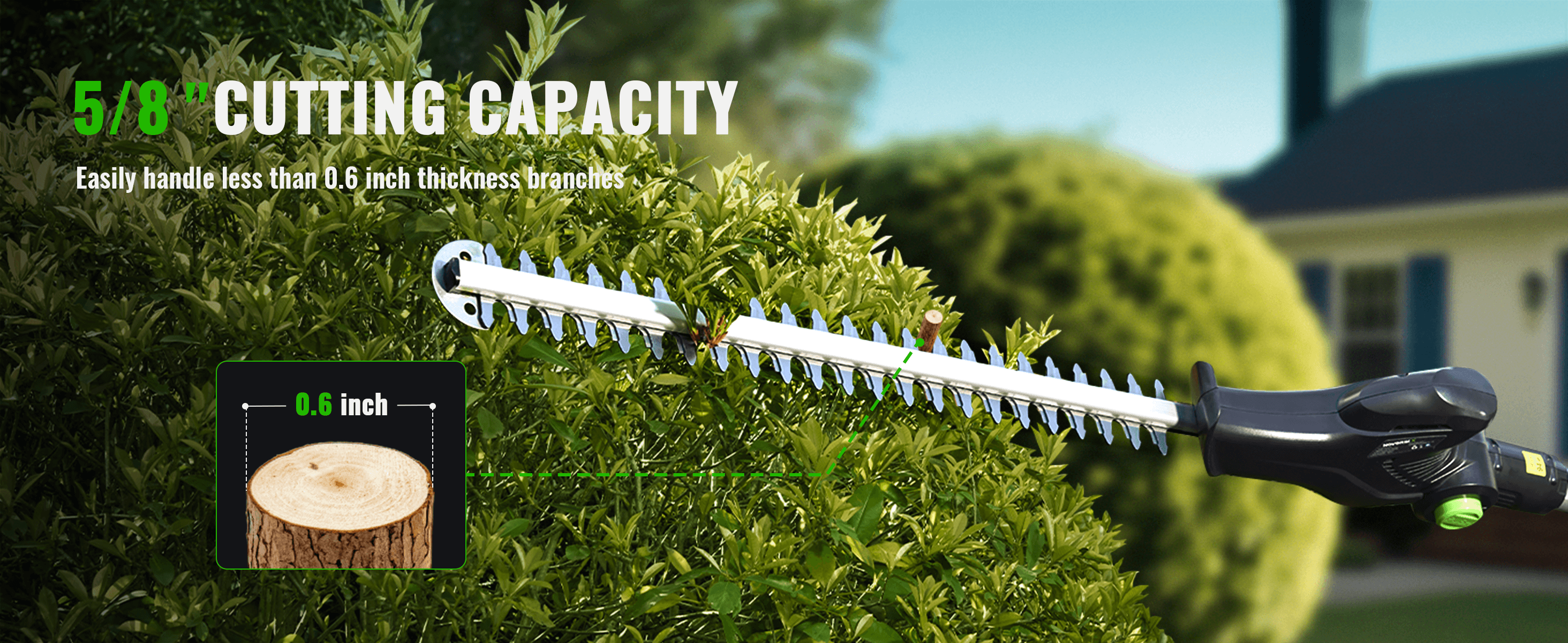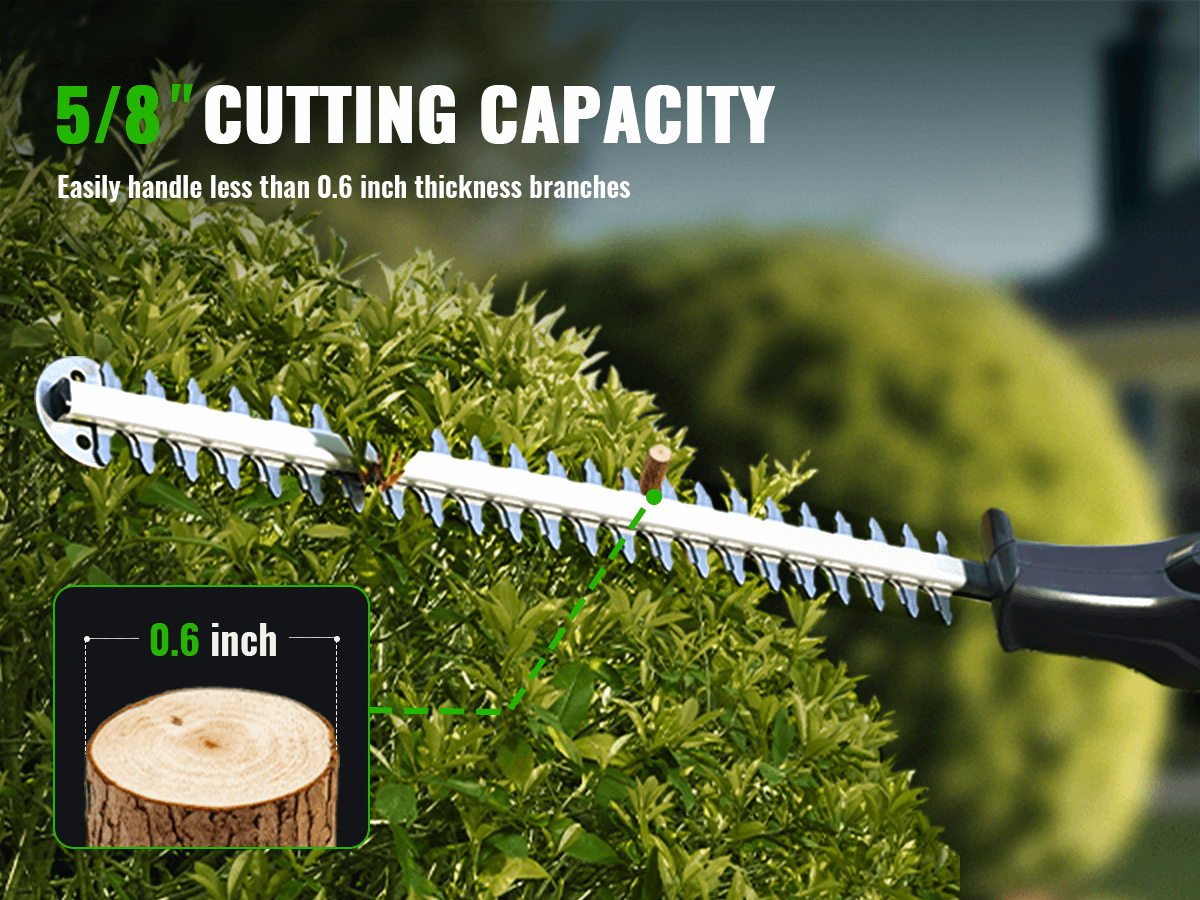 Equipped with 20-inch double-action hardened steel blades that easily trim branches up to 5/8-inch thick, the NovorikX 20V Pole Hedgecutter operates at a speed of 2,700 strokes per minute to help you quickly clean up dense and overgrown hedges, leaving your yard clean and well-maintained.
