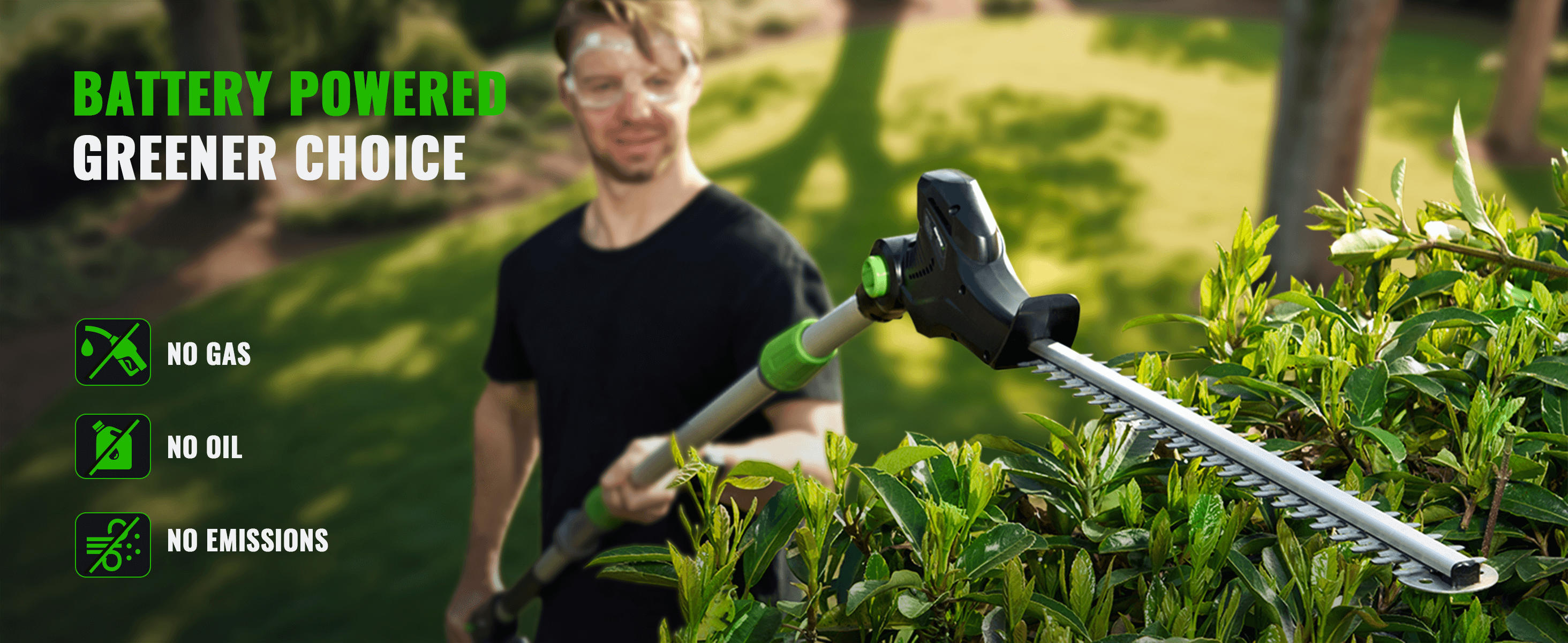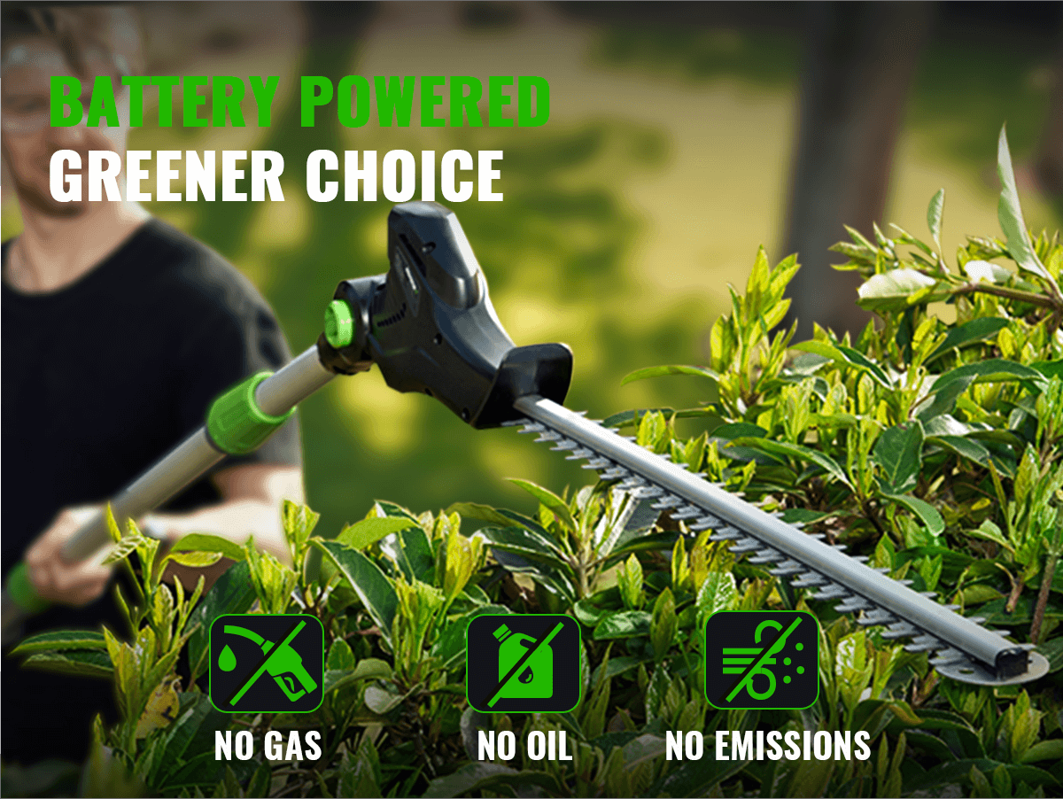 The NovorikX 20V Electric Pole Hedge Trimmer uses clean, rechargeable batteries with no gas, no fumes, and no pull cords. Enjoy quiet, low-maintenance trimming that's better for the environment and your neighbors. It's a smarter, cleaner way to keep your outdoor space looking its best.